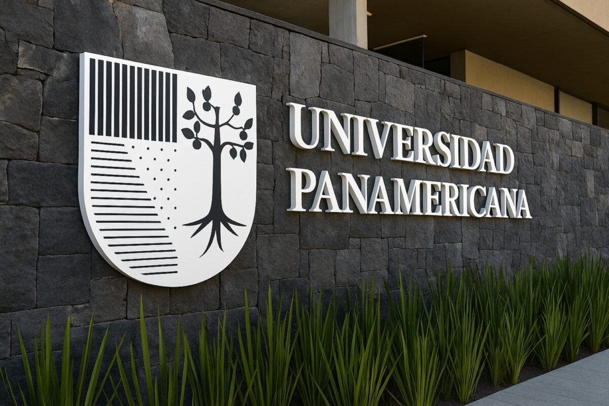 Universidad Panamericana con muro de piedra y escudo institucional